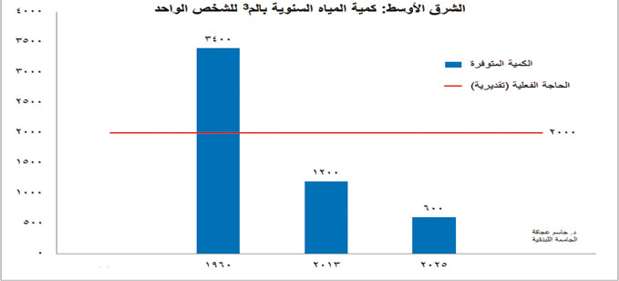 بدأت مشكلة المياه في الشرق الأوسط تأخذ حيزاً مهماً من إهتمامات دول المنطقة مع زيادة عدد السكان في هذه المنطقة وزيادة نسبة الهجرة إلى المدن والطقس الصحراوي في بعض الدول. ومن المتوقع أن يقل حجم المياه الصالحة للإستهلاك بنسبة 80% في العام 2025 نسبة إلى العام 1960 (من 3400 م3 إلى 600 م3 للشخص الواحد سنوياً) والسبب يختلف بين بلدان الشرق الأوسط.