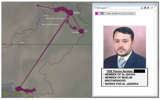 وتستشهد الوثيقة بزيدان كمثال للتدليل على قدرات “سكاي نت” SKYNET، وهو البرنامج الذي يحلل بيانات الموقع والاتصال أو “البيانات الوصفية” من سجلات المكالمات السائبة من أجل الكشف عن أنماط مشبوهة.