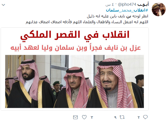 بعد القرار المفاجئ للملك السعودي سلمان بن عبد العزيز بإعفاء محمد بن نايف من منصبه ولياً للعهد، وتعيين نجله محمد بن سلمان بن عبد العزيز ولياً للعهد، تداول ناشطون عبر تويتر بكثافة هاشتاغ #انقلاب_محمد_سلمان. المغرّدون سخروا من مصير بن نايف، معتبرين أن ما حصل هو انقلاب. كما برز على تويتر هاشتاغ #اوامر_ملكيه و#محمد_بن_سلمان_وليا_العهد، نعرض في ما يلي بعضاً منها: