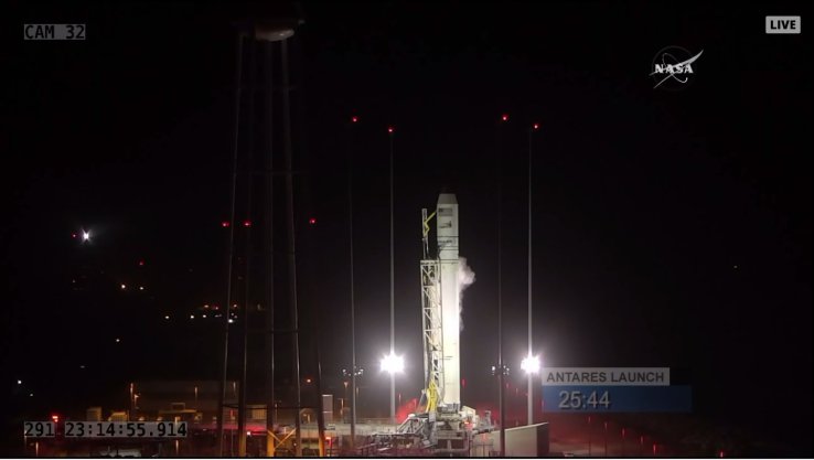 وأطلق الصاروخ المعزز بمحركين جديدين من طراز ار دي-181 من روسيا ويحمل على متنه مركبة الشجن سغنوس في تمام الساعة 7:45 مساء بتوقيت شرق الولايات المتحدة (2345 بتوقيت غرينتش) من منصة إطلاق والوبس فلايت بولاية فيرجينيا.