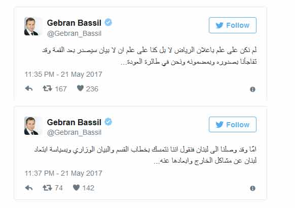 — Gebran Bassil (@Gebran_Bassil) May 21, 2017
