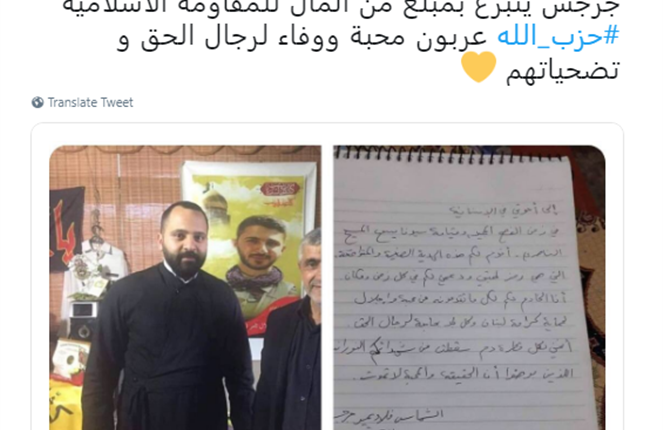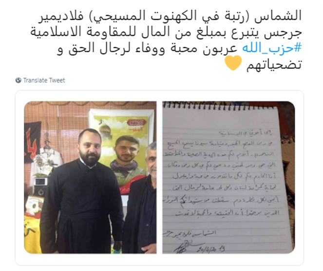 نشر حساب “مسيحي مقاوم” على موقع “تويتر”، صورة للشماس فلاديمير جرجس وكتب: ” الشماس (رتبة في الكهنوت المسيحي) فلاديمير جرجس يتبرع بمبلغ من المال للمقاومة الاسلامية حزب الله عربون محبة ووفاء لرجال الحق و تضحياتهم”.