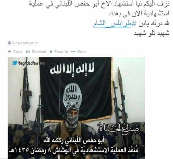 نقل حساب “اخبار طرابلس الشام” على موقع تويتر خبرا عن مقاتل لبناني ملقب بـ”حفص اللبناني” فجر نفسه اليوم في منطقة الوشاش في بغداد، ما ادى الى مقتل وجرح العشرات.
