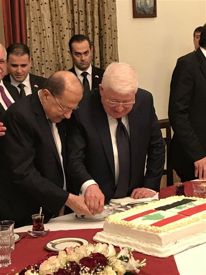 نشر الوزير السابق الياس بو صعب صورة للرئيس العراقي محمد فؤاد معصوم محتفلاً بعيد ميلاد رئيس الجمهورية ميشال عون خلال زيارته للعراق.