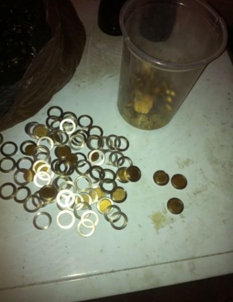 يسحب عدة أكياس صغيرة وسميكة، يجمع القطع النقدية ويدخل بكل كيس 100 قطعة، يغلقه جيداً، ويدخلها لكيس أكبر ويخرج للشارع الرئيسي، ينتظر سائق سيارة، يسلمه القطع النقدية المزيفة ويتلقى منه مقابلها مبلغ 5000 شيقل نقداً.
