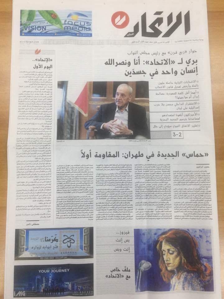 بري في العدد الأول من جريدة الاتحاد: تربطني بالرئيس عون في هذه المرحلة أفضل العلاقات