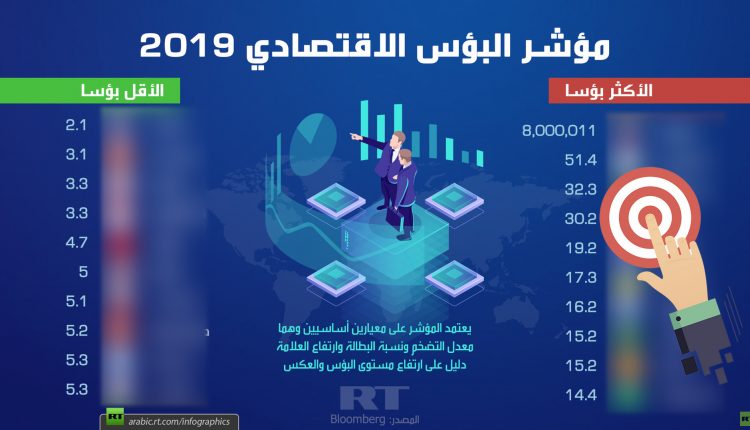 أصدرت وكالة “بلومبرغ” الاقتصادية مؤشر البؤس الاقتصادي العالمي للعام 2019، الذي ضم 62 دولة، من بينها دولة عربية واحدة كانت ضمن الدول العشر الأكثر بؤسا في العالم.