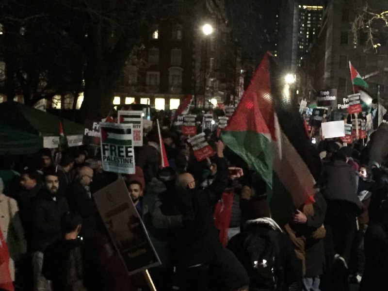 وطالب المتظاهرون الغاضبون بريطانيا والمجتمع الدولي والحكومات في المنطقة بضرورة وضع الاليات واتخاذ القرارات على كافة المستويات السياسية والقانونية لمواجهة قرار ترامب مطالبين بالغائه وازالة جميع الاثار المترتبة عليه.