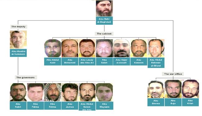 نشرت صحيفة “ديلي تليغراف” البريطانية رسماً توضيحياً يظهر هيكل قيادات “داعش”، وعلى رأسه “الخليفة” المزعوم أبو بكر البغدادي.