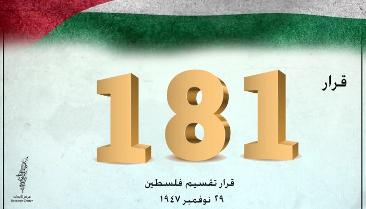 كان أهم ما نص عليه قرار التقسيم الذي حمل رقم /181/ تاريخ 29/11/1947، تقسيم فلسطين بين العرب واليهود الصهاينة، وبينما أعطت الجمعية /56/ بالمئة من مساحة فلسطين “للدولة اليهودية”، أعطت /45/ بالمئة للدولة الفلسطينية، وبقيت القدس وبيت لحم في منطقة خاصة تحت الوصاية الدولية بمساحة تمثّل /5/ بالمئة من مساحة فلسطين، كما قررت الجمعية إقامة وحدة اقتصادية بين الدولتين، وقد أضيفت مناطق جديدة يملكها العرب ويقطنون بها في “الدولة اليهودية” المزعومة، مع إدخال منطقة النقب التي تمثّل نحو نصف مساحة فلسطين إلى هذه الدولة أيضاً، ولم تكن سيطرة اليهود فيها تتجاوز النصف بالمئة.