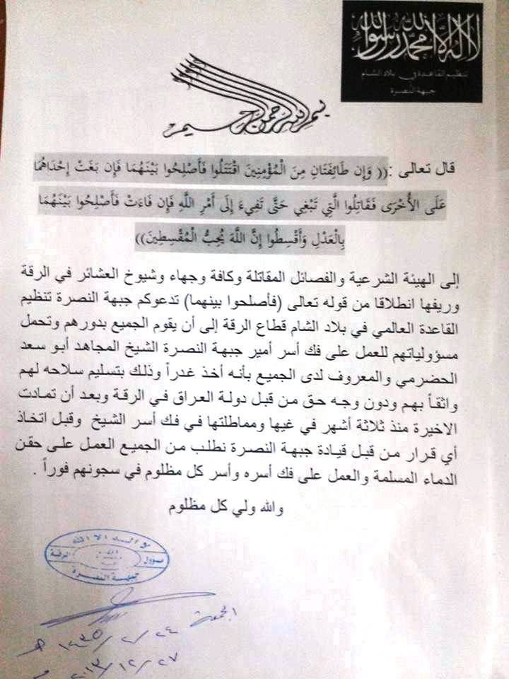 وأصدرت جبهة النصرة” بيانًا رسميًا اليوم الجمعة أعلنت فيه صراحة اتهامها لـ”داعش” باختطاف العبد الله، “دون وجه حق”، داعية الجميع للعمل على فك أسره، “حقنًا للدماء”، وذلك “قبل اتخاذ أي قرار من قبل قيادة الجبهة”.