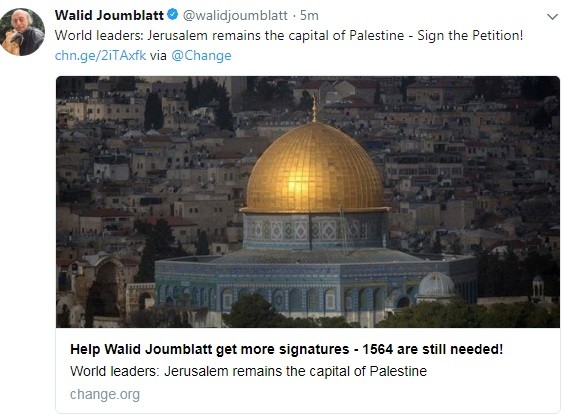 دعا رئيس “اللقاء الديمقراطي” النائب وليد جنبلاط للتوقيع على عريضة، داعمة لبقاء القدس عاصمة لفلسطين.