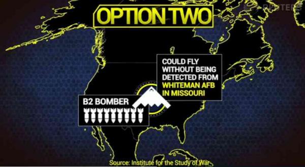 وبالنسبة للخيار الثاني، يمكن لقاذفات بي 2 بعيدة المدى أن تنطلق من الولايات المتحدة دون أن ترصدها اجهزة الرادار السورية، علما أنّ هذه القاذفات يمكنها تنفيذ هجمات تقليدية بصواريخ موجهة من الجو.