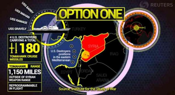 وبحسب الوكالة، وكما يظهر في الرسوم الغرافيكية المرفقة، فإنّ الخيار الأول سيقتضي الاعتماد على مدمرات صواريخ أميركية موجهة موجودة الآن في مياه البحر المتوسط، علما أنّ لدى الولايات المتحدة حاليا أربع مدمرات صواريخ موجهة في شرق البحر المتوسط -“يو.اس.اس جريفلي” و”يو.اس.اس باري” و”يو.اس.اس راميج” و”يو.اس.اس ماهان”. ويمكن للسفن أن تحمل ما يصل إلى 180 من صواريخ توماهوك الموجهة كحد أقصى إذا ما تم تحميلها بهذه الصواريخ فقط. يتوقف العدد الفعلي الذي تحمله في أي وقت على المهمة ونوعية الأسلحة والأنظمة الأخرى المطلوبة. ومن المرجح أن يقع الاختيار على صواريخ توماهوك إذا ما أمر أوباما بتوجيه ضربة إذ يبلغ مداها نحو 1150 ميل (أكثر من 1610 كيلومترات) ويمكن استخدامها عن بعد بدون جهود مشتركة لتدمير الدفاعات الجوية السورية المتكاملة.