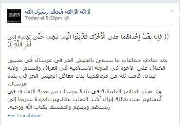 “((فَإِن بَغَتْ إِحْدَاهُمَا عَلَى الْأُخْرَى فَقَاتِلُوا الَّتِي تَبْغِي حَتَّى تَفِيءَ إِلَى أَمْرِ اللَّهِ )) بعد تمادي جماعات ما يسمى بالجيش الحر في عرسال في تضييق الخناق على الإخوة في الدولة الإسلامية في العراق والشام – ولاية لبنان. قامت ثلة من مجاهدينا بدك معاقل الجيش الحر في بلدة عرسال.وإذ نحذر العناصر العلمانية في بلدة عرسال من مغبة التمادي في أعمالهم تحت طائلة إنزال أشد العقاب نطالبهم بالعودة سريعا إلى رشدهم ودينهم والتمسك بكتاب الله ووحيه”.