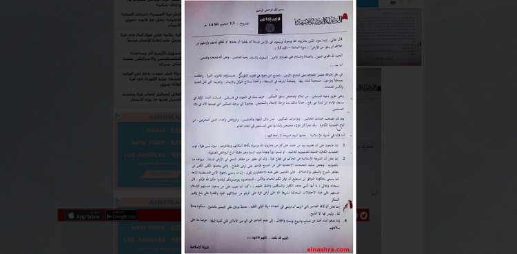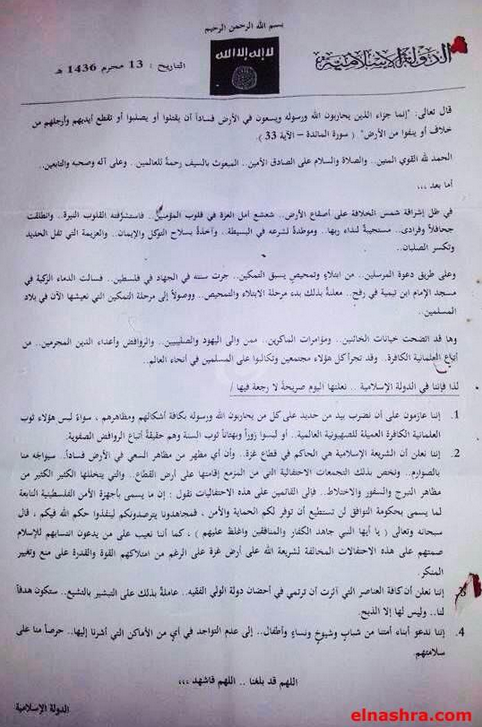 أفاد مراسل “النشرة” في فلسطين أن “تنظيم “الدولة الاسلامية” وجه رسائل تهديد لقيادات حركة “فتح” في قطاع غزة، محذرا في الرسائل التي وجدت على أبواب منازلهم من الخروج من المنزل حتى تاريخ 15/11/2014 كي لا يكونوا عرضة لـ”ضرباتنا التي ستطال كل الخونة والعملاء”.