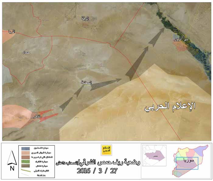 وقد كان للقوة النارية الكبيرة للجيش، والتغطية الجوية لسلاحي الجو الروسي والسوري الدور الفعّال في تشتيت وإرباك مسلحي “داعش” بعد سيطرة الجيش على جميع المرتفعات الحاكمة التي تشرف وتسيطر بالنار على المدينة من سلسلة جبال الهايل وجبال القصور والمثلث الى جبل الطار والسريتل وغيرها من الجبال والمرتفعات والقلعة الاثرية المشرفة على كل مدينة تدمر.
