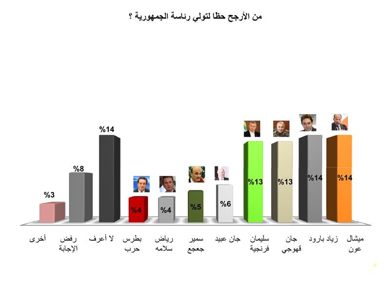 ردا على هذا السؤال، ارتفعت حظوظ زياد بارود فحصل على 14 في المئة، وهي النسبة المماثلة التي حصل عليها عون. يليهما بفارق بسيط قهوجي وفرنجية، بنسبة 13 في المئة من اللبنانيين.
