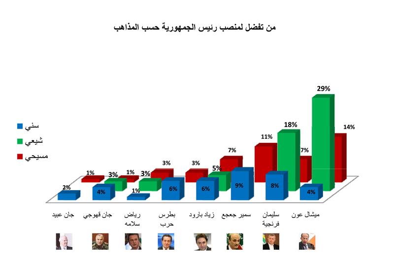 لكن جعجع، اول من اعلن رسميا ترشيحه للرئاسة، حل أولاً بين الموارنة متقدّما على عون العماد عون بفارق بسيط (13 في المئة لجعجع مقابل 11 في المئة لعون). أما فرنجية فحصل على 9 في المئة من الموارنة. (النسب هذه لا تتضمن الأشخاص الذين رفضوا الإجابة او لا يعرفون، وهم يمثلون نصف المستفتين تقريبًا. أي ان كلا من هذه الشخصيات قد حصل على ضعف هذه النسب بين المستفتين الذين أجابوا بإسم رئيسهم المفضل).