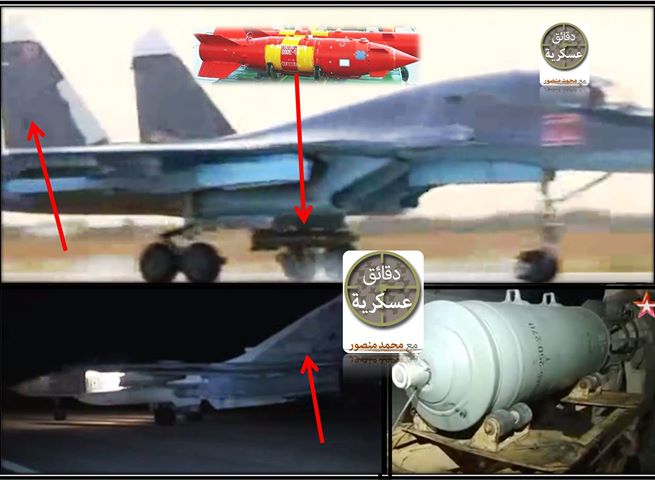 – من الملاحظات المهمة في هذا اليوم تزايد مطرد في أعداد الغارات التي حدثت اليوم “حوالي 80 غارة”، أيضاً تأكد استمرار اخفاء علامات التمييز الخاصة بسلاح الجو الروسي من على القاذفات المنفذة للغارات “الصور المرفقة”. أيضاً كشفت التسجيلات التي تم بثها عن الغارات الليلية التي تم شنها مساء أمس على ريف حمص وريف حماة وإعادة قصف مناطق تم قصفها سابقاً في اللطامنة عن بعض أنواع الذخائر التي تم استخدامها حيث تبين استخدام القنابل الجوية حرة التوجيه شديدة الانفجار “Ofab250-270” من قبل قاذفات السوخوي24 “الصورة المرفقة” والقنابل الموجهه بالأقمار الصناعية “KAB-500/S-E” من قبل قاذفات السوخوي 34 “الصورة المرفقة” وهي من أحدث القنابل الموجهة الموجودة لدى سلاح الجو الروسي.