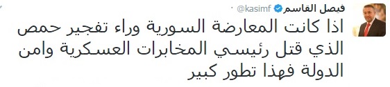 والقاسم كان قد ذكر عقب تفجيرات حمص الأخيرة عبر صفحته على تويتر “إذا كانت قوى المعارضة السورية تقف فعلًا وراء تفجير حمص الذي قتل رئيسي المخابرات العسكرية وأمن الدولة، فهذا تطور كبير، وبداية لحرب عصابات رهيبة ستهز أركان النظام في كل مكان” وبحسب رأي محللين فإن التفجير الذي أودى بعشرات الضحايا في حمص “فتح شهية -الإعلامي في الجزيرة – على التحريض لمزيد من القتل وإراقة الدم بين أبناء بلده السوريين .