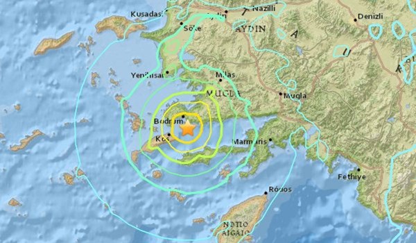 ضرب زلزال بقوة 4.9 درجة على مقياس ريختر، اليوم الثلاثاء، قضاء بودروم التابع لولاية موغلا، غربي تركيا، المطلة على بحر إيجه.