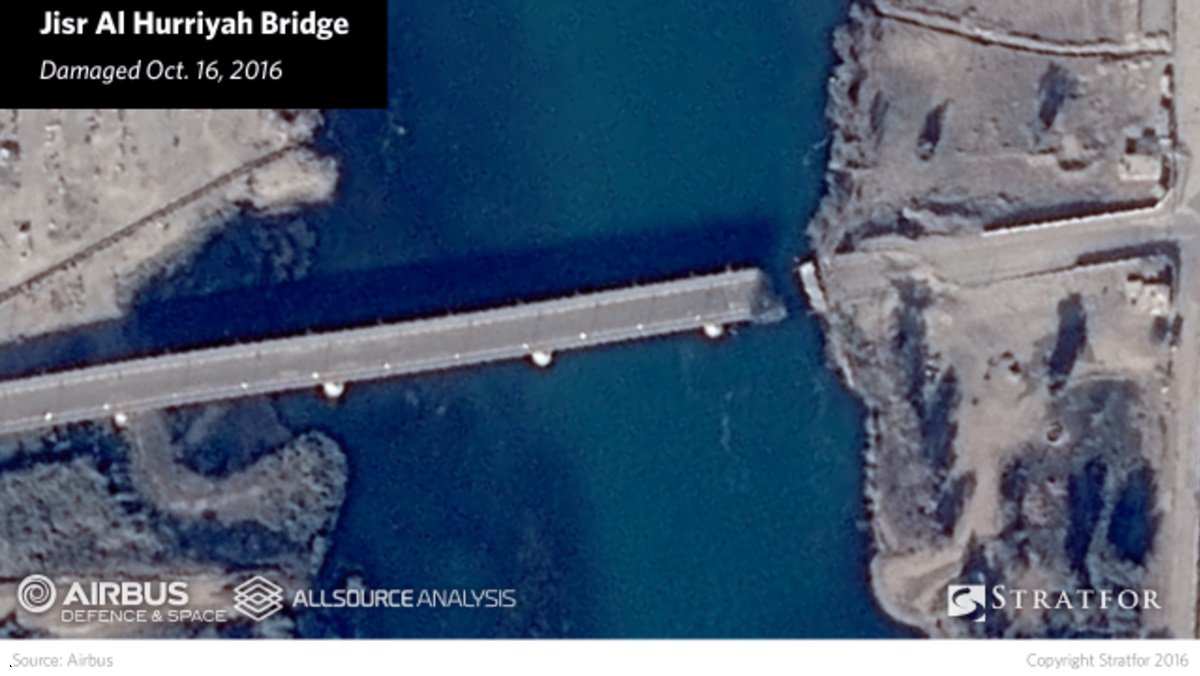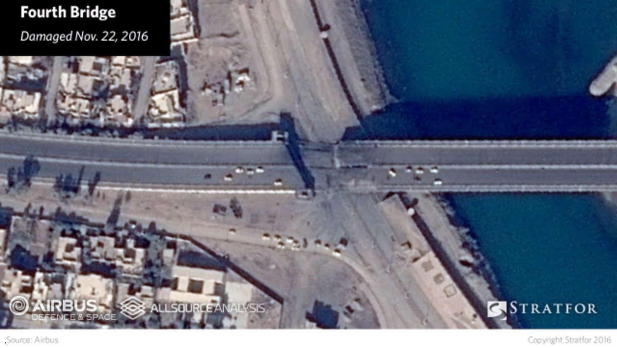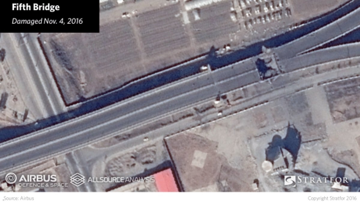 وأظهرت الصور التي التقطت من الجو، ونشرها مركز ستراتفور للدراسات الاستراتيجية والأمنية، الدمار الذي لحق بالجسور الأربعة، الأمر الذي أدى، حسب المسؤولين الأميركيين، إلى عزل المتشددين ومنعهم من نقل شاحنات مفخخة إلى الضفة الأخرى من النهر.