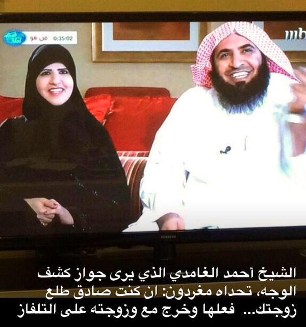 وظهر الغامدي الذي كان مديرا لما يسمى “هيئة الأمر بالمعروف والنهي عن المنكر” في مكة المكرمة في برنامج على قناة تلفزيونية أول أمس وإلى جانبه زوجته جواهر بنت علي التي كانت مكشوفة الوجه وذلك في تحد واضح للتقاليد الصارمة المعتمدة في السعودية فيما ظهرت الزوجة واضعة نظارات شمسية عصرية وكانت تضع مكياجا خفيفا وطلاء أظافر إلا أنها كانت تلبس العباءة السوداء والحجاب.