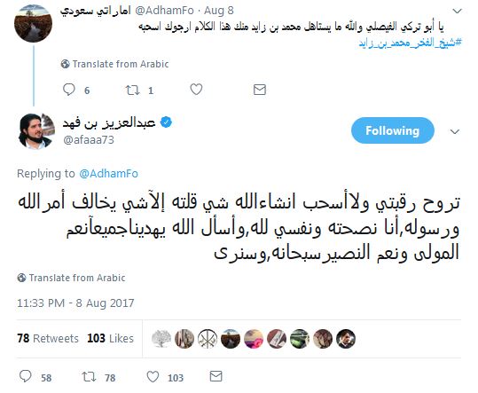 وكان الأمير السعودي عبد العزيز بن فهد، قد شن عبر حسابه الرسمي على موقع “تويتر” هجوما عنيفا على ولي عهد حاكم أبو ظبي الشيخ محمد بن زايد.
