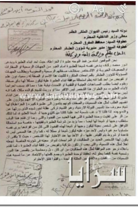 وطالبوا عبر البيان ان يتم محاسبة كل من يتقمص هذا الدور وتسمية نفسه كما يحلو له تحقيقا لوحدة العشيرة وجمع كلمتهما والابتعاد عن ما تسببه هذه التسميات من مناكفات وخلافات في العائلة الواحدة .