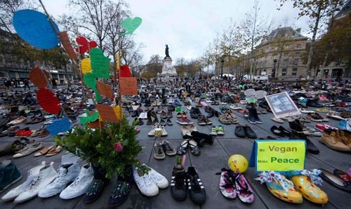 أحذية في احد الشوارع الفرنسية بدلًا من المتظاهرين الذين تم منع تظاهراتهم