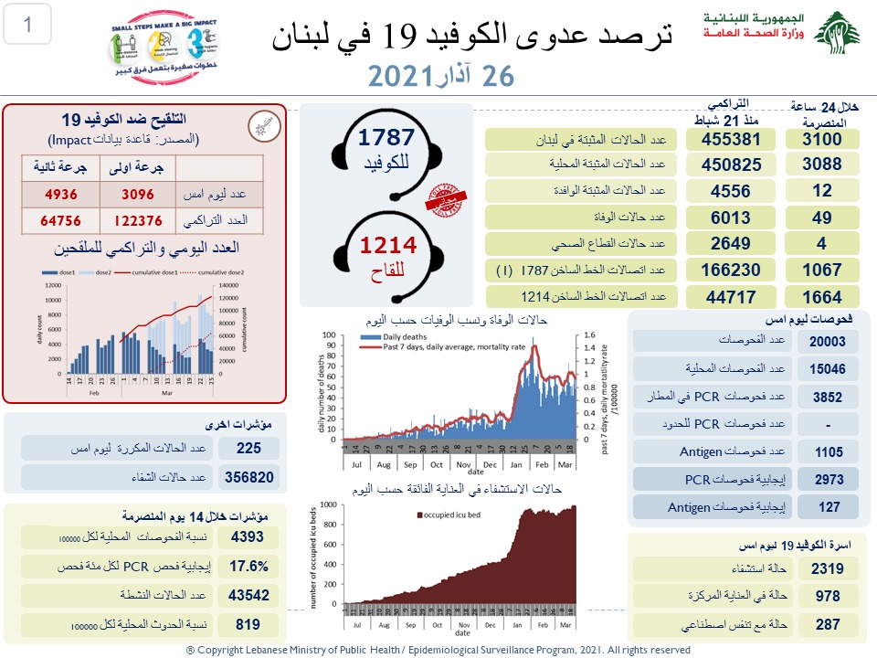 أخبار بارزةاخبار لبنانالعرب كورونا في لبنان.. تسجيل 49 وفاة و3100 إصابة جديدة بتاريخ مارس 26, 2021 0 أعلنت وزارة الصحة اللبنانية الجمعة انه تم تسجيل 49 وفاة و3100 إصابة جديدة بوباء كورونا خلال الـ24 ساعة الماضية. إصابة جديدةكورونالبنانوفاة 0 مشاركة FacebookTwitterGoogle+ReddItWhatsAppPinterestالبريد الإلكتروني