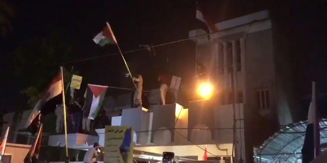 اقتحم متظاهرون عراقيون اليوم مقر سفارة النظام البحريني في بغداد احتجاجا على عقد ما يسمى “ورشة المنامة” التي تهدف إلى تمرير “صفقة القرن” وتصفية القضية الفلسطينية ورفعوا العلم الفلسطيني فوقها.