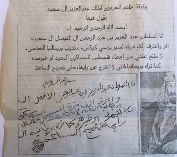 في اللقاء الأول عام 1915، والذي جمع السير بيرسي كوكس المعتمد البريطاني في سواحل الخليج في مخيم العقير مع الأمير عبد العزيز بن سعود تم تعيين الأمير سلطاناً على نجد والقطيف والاحساء والجبيل. وبعد التهنئة والتبريك طلب كوكس إقامة وطن لليهود في فلسطين. وهذا ما كان، إذ سحب كوكس ورقه من جيبه وناولها للسلطان، وخط رسالة بيده بأحرف تدل على تدني معرفته التعليمية، وفك الأحرف كما يقال… وقال فيها: أنا السلطان عبد العزيز بن عبد الرحمن الفيصل آل سعود أقرّ وأعترف للسير بيرسي كوكس مندوب بريطانيا العظمى لا مانع لدي من إعطاء فلسطين لليهود أو غيرهم كما ترى بريطانيا التي لا أخرج عن رأيها حتى تصيح الساعة”.