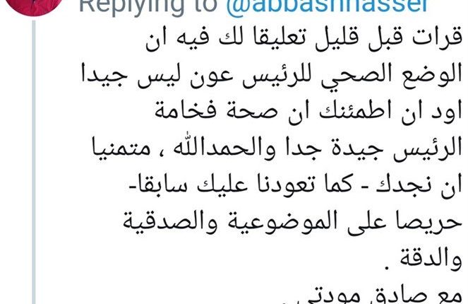 وأضاف في تغريدة أخرى: “وهي فعلا غير دقيقة، لا بل لا اساس لها. نستعد الاسبوع المقبل لزيارة رسمية الى موسكو ومن ثم الى القمة العربية في تونس، وفي وقت لاحق سنلبي دعوة رسمية لزيارة الصين… نراك بخير وبصحة جيدة ان شاء الله”.