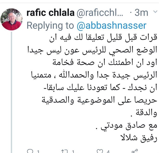 وردا على تغريدة لأحد الناشطين عبر تويتر، كتب شلالا: “قرأت قبل قليل تعليقا لك فيه ان الوضع الصحي للرئيس عون ليس جيدا. اود ان اطمئنك ان صحة فخامة الرئيس جيدة جدا والحمدالله، متمنيا ان نجدك – كما تعودنا عليك سابقا- حريصا على الموضوعية والصدقية والدقة”.