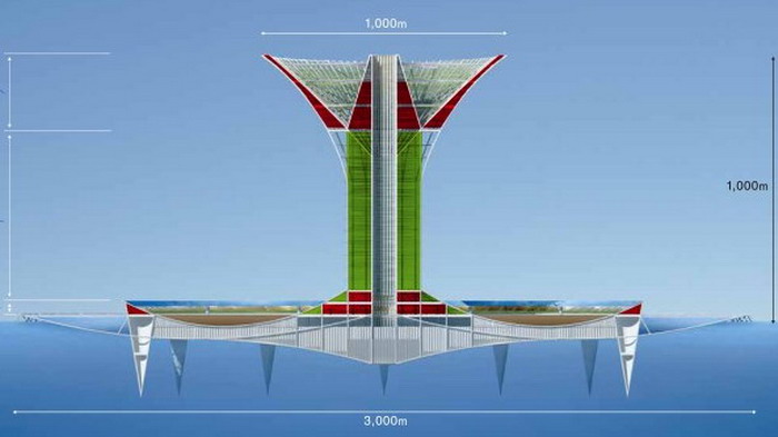 وكل من هذه الجزر يتوسطه برج مركزي بطول يزيد عن 800 متر، مجهز بأماكن سكنية تتسع لثلاثين ألف شخص.