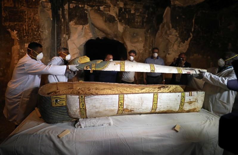 عملماء آثار يفتحون تابوتا أثريا داخل مقبرة بالأقصر يوم السبت. تصوير: محمد عبد الغني – رويترز