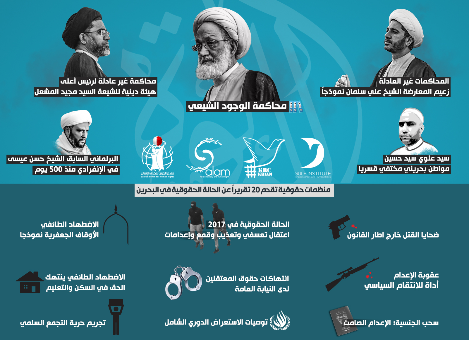 وتسلط التقارير الضوء على مختلف انتهاكات حقوق الإنسان بدءً بانتهاكات القضاء في البحرين عبر محاكمة الوجود الشيعي واستهداف القادة السياسيين والدينيين مثل زعيم المعارضة الشيخ علي سلمان والبرلماني المعارض الشيخ حسن عيسى القابع في السجن الانفرادي منذ أكثر من عام ورئيس أعلى هيئة دينية للطائفة الشيعية عالم الدين السيد مجيد المشعل الذين يواجهون محاكمات غير عادلة بحسب التقارير.