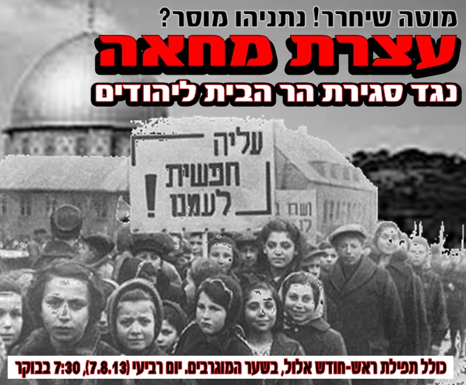 دعت حركات ومنظمات يهودية – تنشط في تحقيق خرافة الهيكل المزعوم- لتنظيم مسيرة وتظاهرة حاشدة عند أبواب المسجد الأقصى يوم (الأربعاء) 7/8/2013 ، للمطالبة بحرية دخول اليهود للمسجد الاقصى الذين يطلقون عليه تسمية ‘جبل الهيكل’.