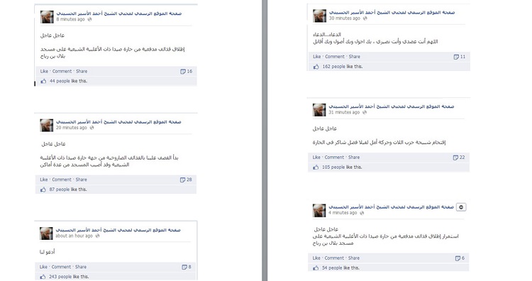 أول تعليق استهل به الاسير فتنته على الموقع كان: “عاجل عاجل اطلاق قذائف مدفعية من حارة صيدا ذات الأغلبية الشيعية على مسجد بلال بن رباح”. يبدو أن الاسير اراد “هزّ” عصا الفتنة بكل ما أوتي من قوة. فرسالة الفتنه واضحة، فالأسير يقول بصورة مبطنة “شباب شيعة من قرية شيعية يطلقون قذائف مدفعية على مسجد بلال بن رباح السنّي”.