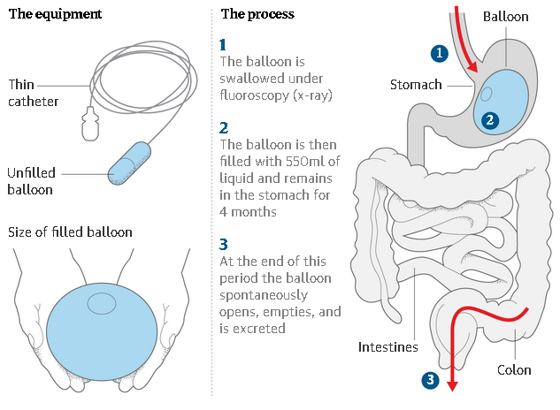 وتستغرق عملية بلع البالون وامتلائه بالماء، نحو 15 دقيقة فقط، حيث يمكن القيام بها من قبل أخصائي التغذية، بدلا من الطبيب الجراح. وبعد أربعة أشهر، ينفجر البالون تلقائيا ويخرج من الجسم، لذا لا يوجد حاجة لإجراء عملية جراحية لإزالته.
