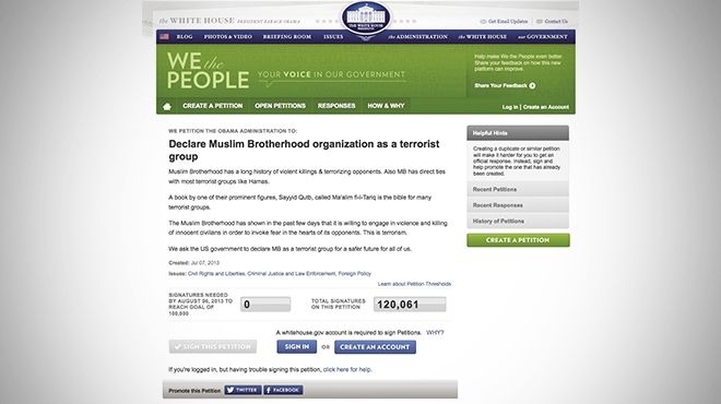 وصل عدد المواطنين الأمريكيين المطالبين بإدراج جماعة الإخوان فى قائمة المنظمات الإرهابية إلى أكثر من 120 ألف صوت، سجلوا رغبتهم فى ذلك على موقع البيت الأبيض حتى ظهر الثلاثاء (30.7.2013)، فيما يتزايد العدد باطراد ملحوظ. ويسمح موقع البيت الأبيض بوضع التماس خاص بأى اقتراح أو طلب لمدة شهر على الموقع الرسمى للبيت الأبيض، على أن تبدأ الإدارة الأمريكية النظر فيه إذا تجاوز عدد المصوتين لصالح الاقتراح 100 ألف مواطن، قبل انتهاء موعد التصويت فى 6 أغسطس/آب المقبل، ثم يُعرض الأمر للمناقشة فى الكونجرس. وتضمنت عريضة التصويت أو الالتماس، الذى يكشف الموقع عن هوية مقدميه، أن الإخوان لديهم تاريخ طويل من عمليات العنف والقتل وعلاقات مباشرة مع معظم الجماعات الإرهابية. وأشارت عريضة التصويت إلى سلوك الإخوان خلال الأيام الماضية الذى كشف عن استعدادهم للانخراط فى العنف وقتل مدنيين أبرياء لإرهاب خصومهم، ولهذا طالبت عريضة التصويت حكومة الولايات المتحدة بأن تعلن «الإخوان» جماعة إرهابية من أجل مستقبل أكثر أمناً للجميع. وقالت الدكتورة هالة مصطفى، المحللة السياسية: إنه لم يسبق إدراج أى جماعة أو تنظيم فى قائمة الجماعات الإرهابية الأمريكية عن طريق هذه الآلية.